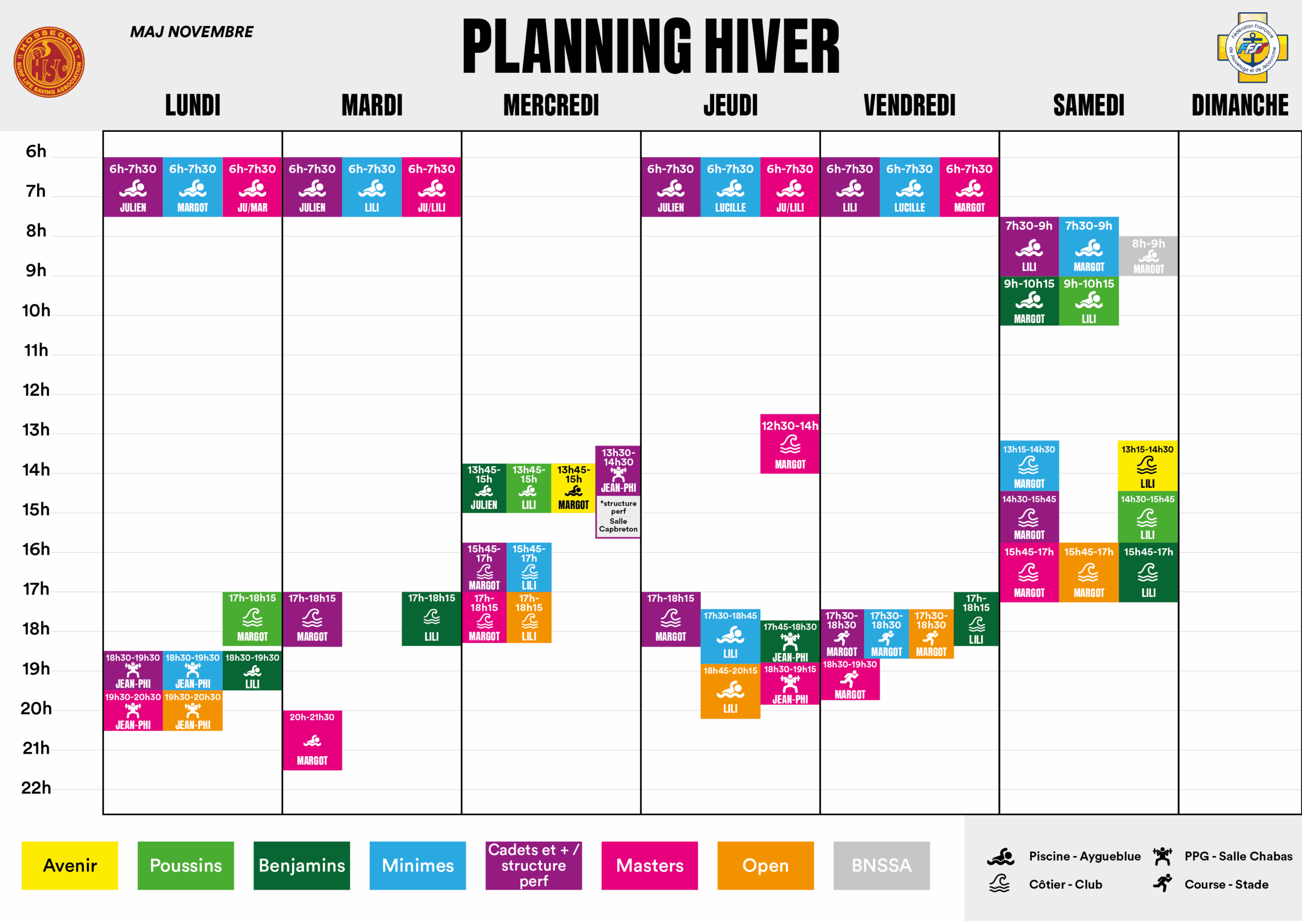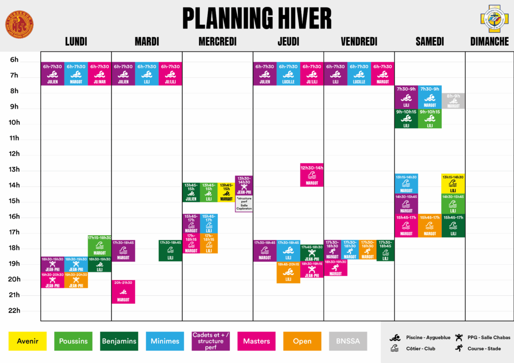 Les entrainements de piscine se font à la Aygueblue (Saint-Geours-de-Maremne), les entrainements de Côtier sont à la plage Centrale d’Hossegor à notre local sur la plage en dessous de la place des Landais, les entrainements course à pied se font au stade de Capbreton et les séances PPG dans la Salle Chabas.